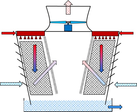- Teplá voda přicházející z průmyslového procesu je rozstřikována nebo stéká přes výplň věže - chladicí systém (tzv. zkrápěcí povrch).